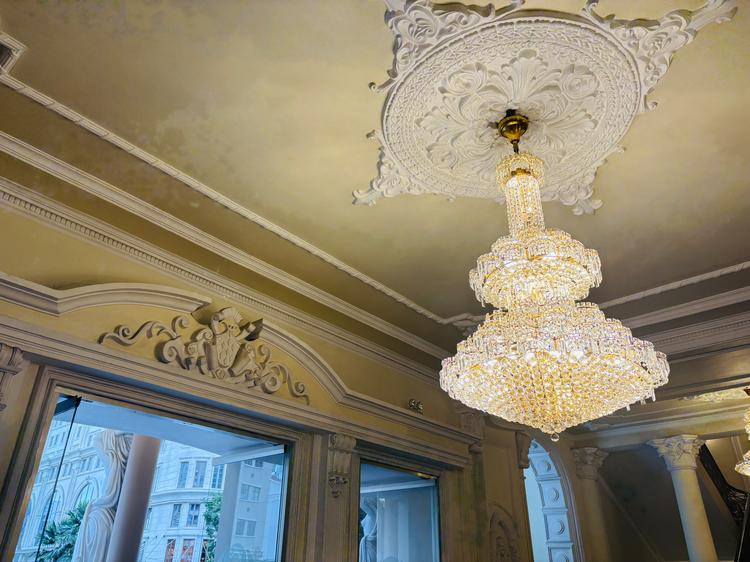 天井を見るとクリスタル風のシャンデリアが吊られていて、優雅さと重厚さを兼ね備えた雰囲気を感じます。