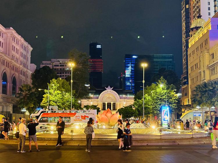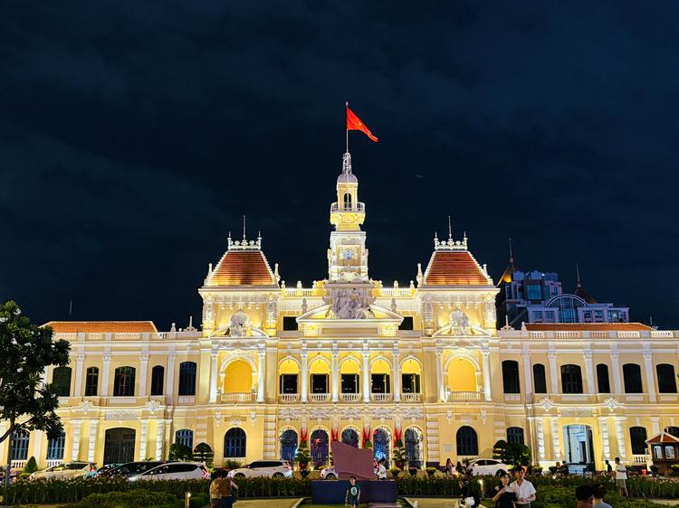 その背後にそびえる人民委員会庁舎は、白亜のフレンチコロニアル建築が美しく、夜にはライトアップされて一層華やかで素敵です。