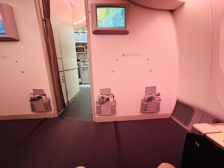 今回は私のみエコノミークラス最前列のバルクヘッド席になったのですが、これイマイチですね…足元は広いけど、モニターが引き出すタイプなので面倒だし画面小さいし、おススメできません。ま、どうせ寝るだけだから良いけど……;つД`)