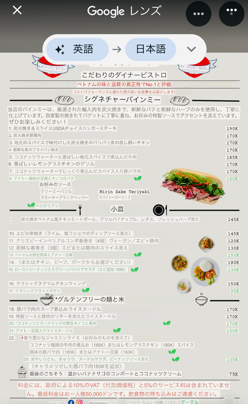 メニューもGoogleレンズを使えば、英語がわからなくても余裕ですね~。便利。