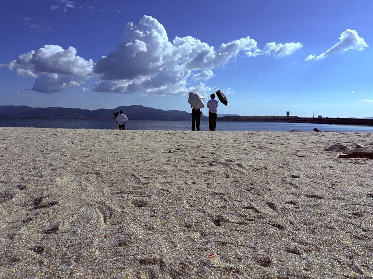 砂浜が光っている正体は、廃ガラスを細かく砕いて丸く加工した「再生砂」を敷き詰めて作られた人工の浜とのことで、この写真ではちょっとわかりにくいのですが、確かにキラキラと光っていて綺麗でした☆