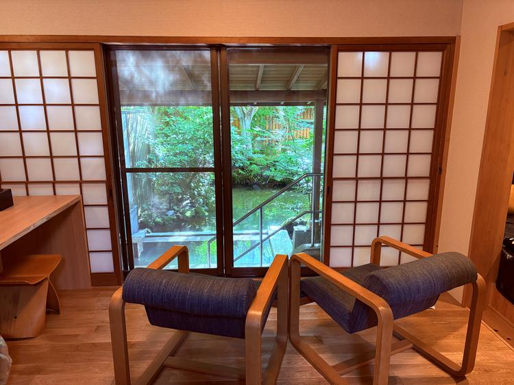 とても静かな広い池のある日本庭園に面していて、窓の外一面に和風の庭園が広がるつくりのお部屋でした。