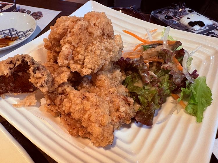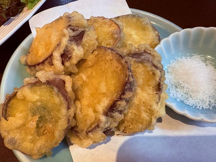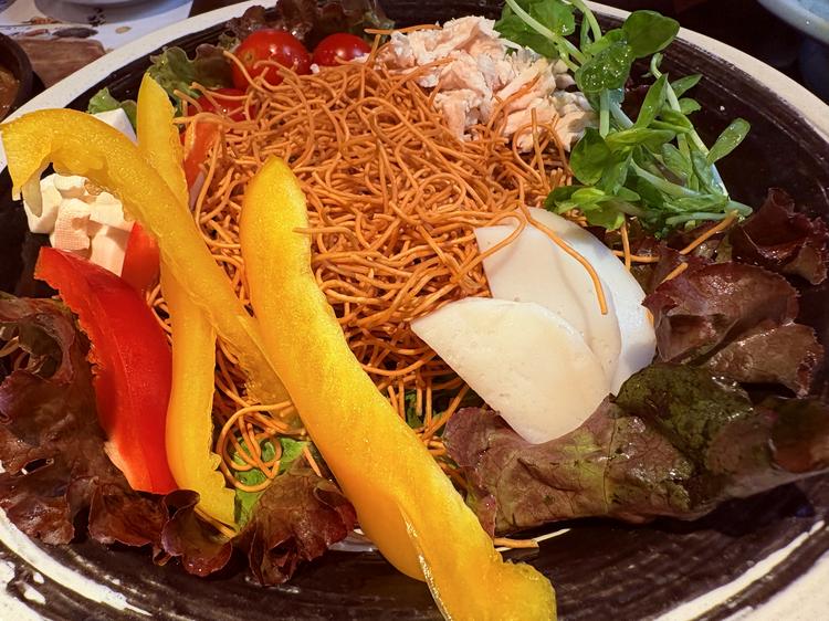 長崎パリパリサラダ、鶏の唐揚げ、さつま芋の天ぷら、穴子釜めし