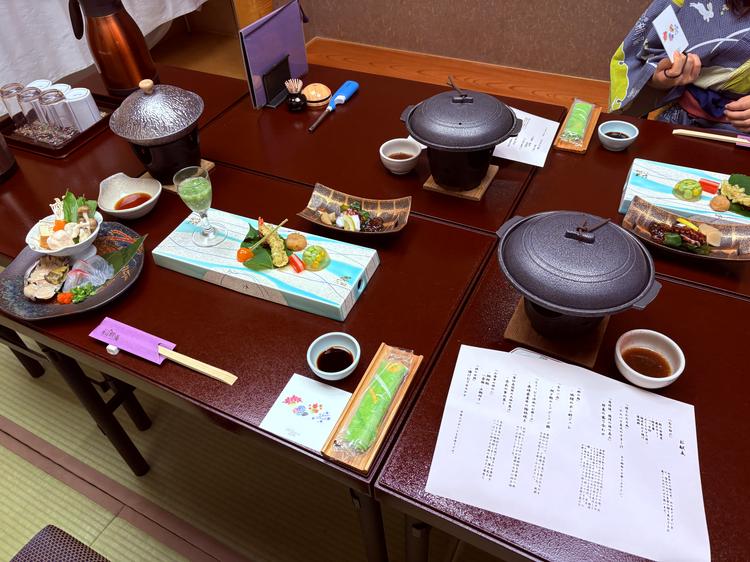 風仙会席は、ゆやど雲仙新湯の「基本会席をグレードアップしたプラン」で、アワビを中心に海の幸を贅沢に味わえるコースです。