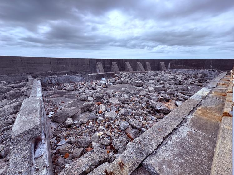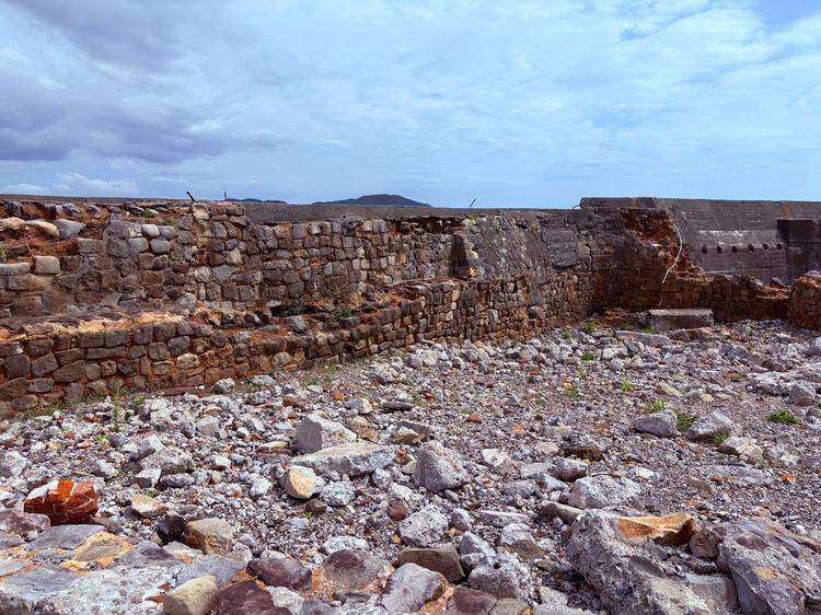 この赤レンガのような壁が、軍艦島にある世界遺産の一つ「護岸」
