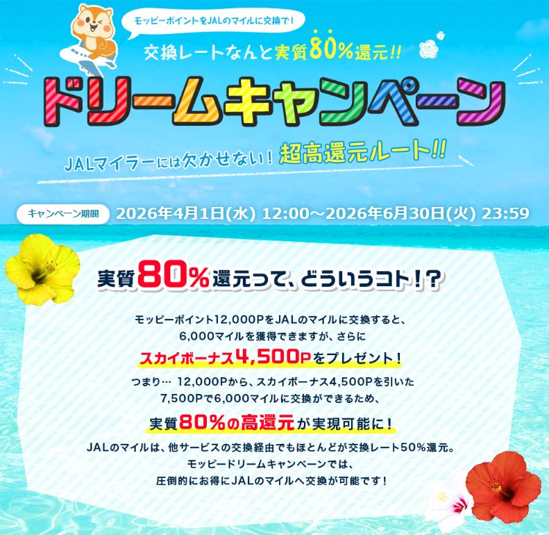 JALマイル還元率が最大で80.0%と言う脅威の還元率がポイントサイト大手のモッピーで実現されました。モッピーはANAマイル・JALマイル、両方の陸マイラー応援キャンペーンを実施していますので、今この ...