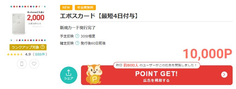 例えば下記の様な広告案件などは、申し込み後1日以内にポイントが予定反映されますし、1回で10,000ポイントが獲得できて簡単+エポスカードのキャンペーンでさらに2,000ポイントがプレゼントされるのでおススメです。