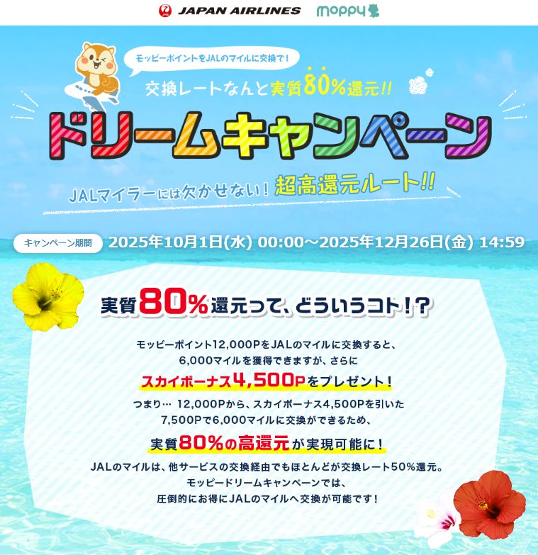 モッピーのポイントをJALマイルに交換すると、通常では10,000ポイント→5,000マイルになってしまいますが、キャンペーンを利用することで、10,000ポイント→実質8,000マイルにすることが可能です。