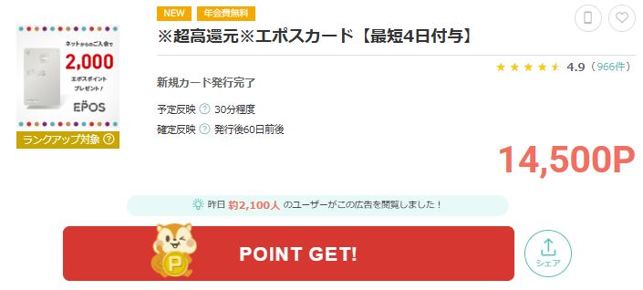 例えば下記の様な広告案件などは、申し込み後1日以内にポイントが予定反映されますし、1回で14,500ポイントが獲得できて簡単+エポスカードのキャンペーンでさらに2,000ポイントがプレゼントされるのでおススメです。