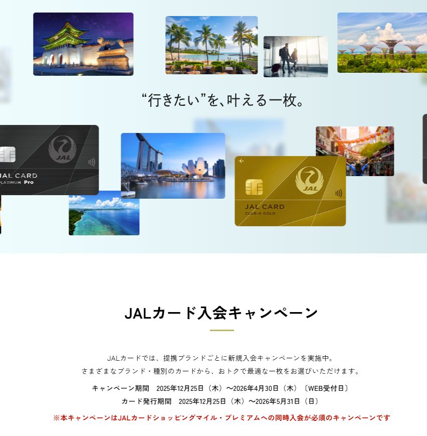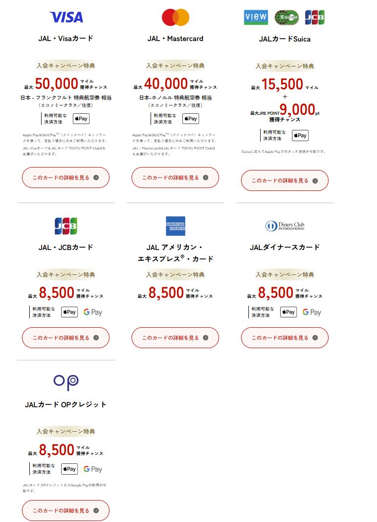 - JAL・Visaカード:最大50,000マイル獲得チャンス