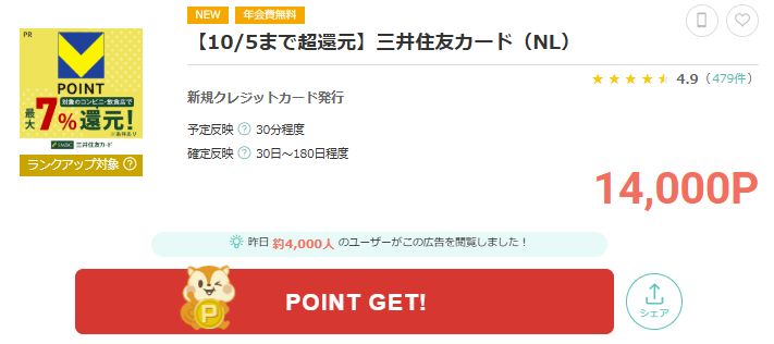 この三井住友カードは、入会で14,000モッピーポイントのキャンペーン中+三井住友カードのキャンペーンの条件達成で21,600円相当がもらえるのでダブルでオイシイ案件です。